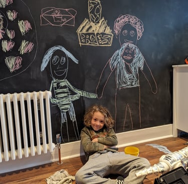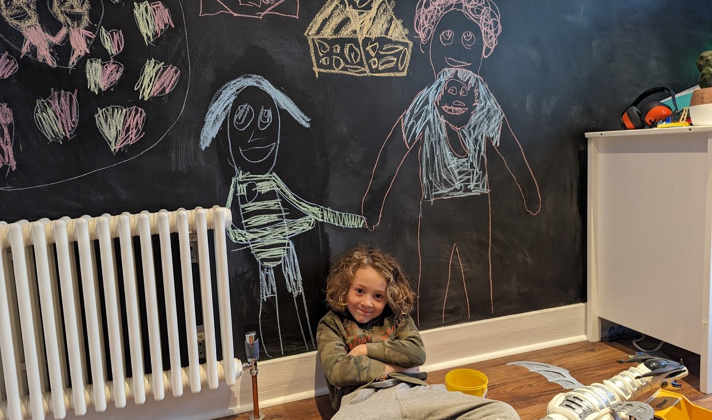We decorated the room, adding shelving and new laminate flooring together with a cool new chalkboard wall.